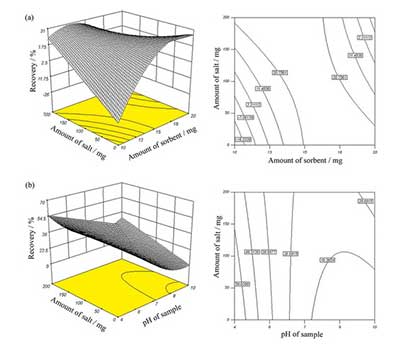 響應(yīng)曲面和等高線圖顯示了:(a)鹽和吸附劑的量,和(b)鹽的量和溶液的pH對乙烯回收率的影響。