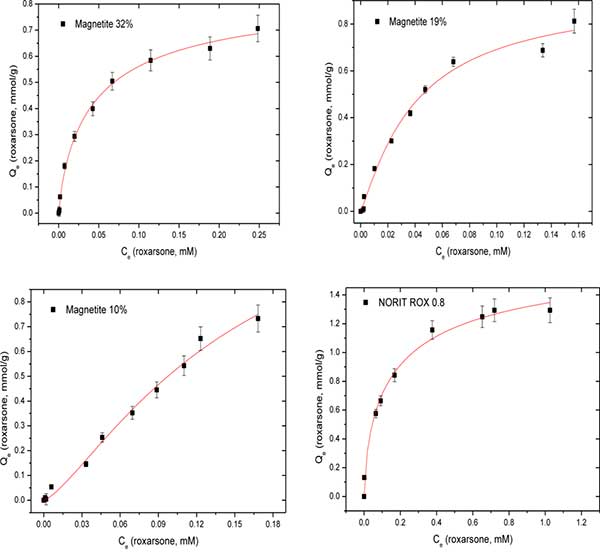 在合成磁鐵礦(Mag-P),商用磁鐵礦(Mag-C),具有可變磁鐵礦(32%,19%和10%; w / w%)的活性炭-磁鐵礦復(fù)合物的洛克沙胂等溫條件下吸著吸收結(jié)果針鐵礦如圖1和表1所示。利用活性炭實(shí)現(xiàn)了羅克沙星的最大單層吸附容量(Q m = 1.783mmol / g)。盡管活性炭含有較低的Fe含量作為雜質(zhì),因此其吸附去除羅克沙星主要?dú)w因于非共價(jià)相互作用,例如羅克沙酮的苯環(huán)與活性炭的石墨烯表面之間的π-π堆積和氫鍵。在復(fù)合材料(CM-10,-19和-32)的情況下,隨著活性炭含量的增加,羅克沙星的Q m值增加,正如對疏水效應(yīng)影響的吸附過程所預(yù)期的那樣。相反,鐵氧化物組分,如磁鐵礦,針鐵礦和磁鐵礦的復(fù)合材料,其具有的π電子受體(路易斯酸)由于鐵物質(zhì)的吸附劑表面上存在位點(diǎn),特別是對于無機(jī)砷酸鹽。