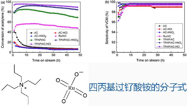 雖然乙炔的加成反應與氯化氫是氯乙烯單體(VCM)的直接合成的重要途徑,在傳統(tǒng)的工業(yè)用過的催化劑是活性炭載的HgCl2,其擁有一個嚴重的環(huán)境污染和人員危險其高毒性和易燃性。再加上汞資源短缺,非汞催化劑的研究一直是重點。發(fā)現(xiàn)納米結(jié)構(gòu)載體,如Al2O3 ,金屬有機骨架(MOFs)衍生的固體堿,介孔二氧化硅納米顆粒[MSN] ,金屬氧化物載體(MO x)等。通常用于催化反應。但由于其物理化學性質(zhì)不同,其中有些不利于乙炔氫氯化的有效支持。受益于表面上發(fā)達的孔結(jié)構(gòu)和相互作用,活性炭成為乙炔氫氯化反應的理想材料,載體表面的官能團可以影響活性炭的性質(zhì)。高價釕是乙炔氫氯化Ru催化劑的關(guān)鍵活性組分。通常通過改變RuCl 3獲得高價釕物種或載體,關(guān)于釕配合物催化劑與高價釕催化劑在乙炔氫氯化反應中的應用相關(guān)的文獻很少。因此,本文采用一定濃度的鹽酸或硝酸處理交流負載四丙基過釕酸銨(TPAP)制備了Ru基活性炭催化劑,并對乙炔氫氯化反應的催化性能進行了評價,希望找到一種容易制備,更高活性,更穩(wěn)定和經(jīng)濟的無汞催化劑。