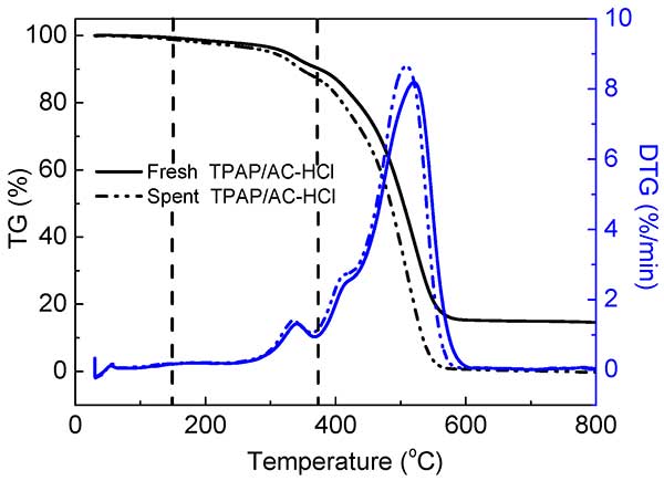 如圖2所示,通過TGA研究了廢催化劑的焦炭沉積。以TPAP/活性炭-HCl為例,不僅新鮮的TPAP/活性炭-HCl催化劑在150℃以前因在催化劑表面發(fā)生水解或小分子解吸而出現(xiàn)輕微的質(zhì)量損失。在150-385℃的范圍內(nèi),新鮮催化劑和廢催化劑均有緩慢的質(zhì)量損失。然而,當溫度超過385℃時,由于載體的燃燒,催化劑質(zhì)量損失快??紤]到這一點的活性炭本身會失去它的重量在空氣氣氛中,以產(chǎn)生CO 2,在150-385℃的范圍內(nèi)的質(zhì)量損失反映了花費TPAP/活性炭-鹽酸催化劑上的焦炭沉積量。