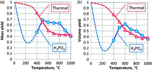 圖1.質(zhì)量(a)和體積(b)碳化過(guò)程中聚酰亞胺共聚物在有和沒(méi)有磷酸的情況下變成活性炭。