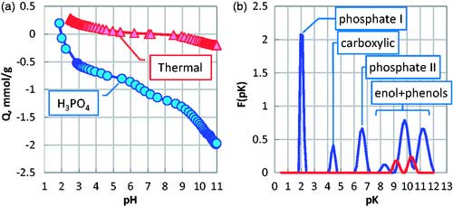磷酸活化的活性炭有豐富表面官能團(tuán)由電位滴定法證明。質(zhì)子結(jié)合等溫線表明,無(wú)磷酸熱處理得到的活性炭在pH約為7時(shí)具有PZC中性表面,并含有非常少量的表面基團(tuán)(圖4(a))。相反,通過(guò)磷酸活化獲得的活性炭在酸性表面基團(tuán)的高濃度下在約pH 2下顯示具有PZC的酸性表??面。酸性表面基團(tuán)的計(jì)算分布顯示磷酸基團(tuán)的存在顯然源于磷酸、 羧酸基團(tuán)、磷酸酯基,烯醇和酚基的第二解離常數(shù)(圖3(b))。