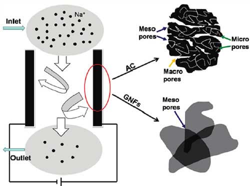 電容去離子技術(shù)采用活性炭和石墨烯納米片(GNFs)電極的機(jī)理。在研究人員進(jìn)行的實驗中,他們將石墨烯納米片基電極與傳統(tǒng)活性炭電極進(jìn)行了比較。他們指出,“盡管具有較大的表面積(989.54米2 /克)比石墨烯納米薄片(222.01米2 / g)中,活性炭具有僅13.73微摩爾/克,這比石墨烯納米薄片的低得多的electrosorptive容量(其電吸附容量為23.18μmol/ g)“。