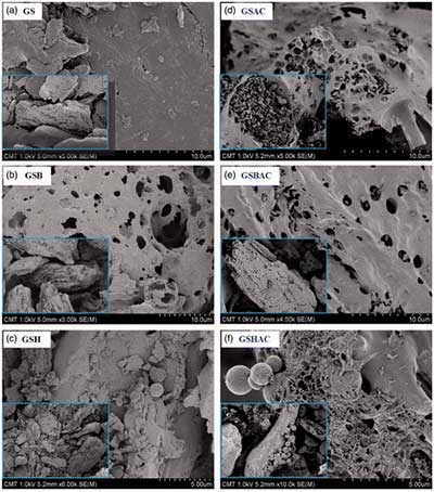 圖1顯示了合成的活性炭及其前體的形態(tài)。木質(zhì)纖維素和水熱材料孔隙度低,表面相當(dāng)粗糙。這些觀察結(jié)果與它們的低S BET和總孔體積相匹配。GSH中的微球在圖1中可見,是由GS在熱液碳化過程中的高纖維素組分形成的。但木質(zhì)素含量高可能會(huì)阻止氫化活性炭樣品中大量碳球的形成。此外,水熱過程中纖維素和木質(zhì)素的分解較弱,可能是氫化活性炭孔隙發(fā)育不良的原因。當(dāng)木質(zhì)纖維素材料在高溫下熱解時(shí),生物活性炭的形態(tài)可以觀察到顯著的變化。生物活性炭的表面形態(tài)示出發(fā)達(dá)的孔隙和相當(dāng)高的表面積,并且因此,生物活性炭可以被認(rèn)為是一個(gè)綠色的吸附劑在廢水處理過程中使用。