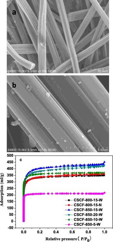 SEM和氮吸附/脫附等溫線進行選擇活性炭來說明表面形態(tài)和孔結(jié)構。如圖所示圖一,棉桿制成的活性炭形態(tài)是光滑的,并且微晶是清楚的。在不同活化溫度制備四個選定的樣品的氮吸附等溫線和停留時間。它可以從中可以看出該四個選擇的樣本的所有的等溫線顯示了在低的相對壓力的急劇增加(P / P 0< 0.05),說明在碳骨架大量微孔的產(chǎn)生?;钚蕴康牡葴鼐€的下面部分幾乎是線性的,吸附和解吸的分支基本上是一致的。