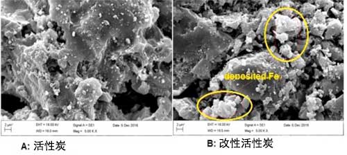 圖1。 原料活性炭(A)和改性活性炭(B)的SEM圖像。