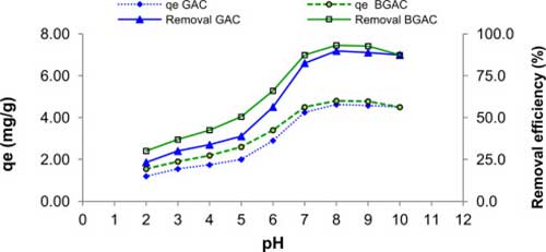 圖3?;钚蕴亢透男曰钚蕴吭诓煌琾H值下的脫鋁效率和吸附容量。吸附劑用量:2g / L,鋁濃度:10.3mg / L,接觸時(shí)間:24小時(shí),攪拌速度:250rpm。